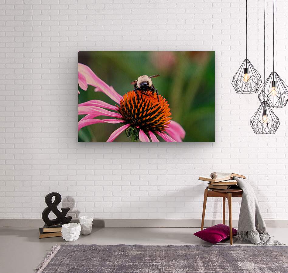 The Bee Collection. A sharp contrast of the golden-orange cone bristles with the soft lavender petals draws the eye in and holds it. The bee, mid-gathering, adds motion and meaning to the composition. Each element, color, texture, light, comes together to paint a portrait of ecological purpose and subtle beauty. This piece brings structure and softness in equal measure, ideal for contemporary or rustic interiors. As a symbol, it merges vitality with patience, making it a perfect daily visual mantra for presence, productivity, and appreciation of natural design.