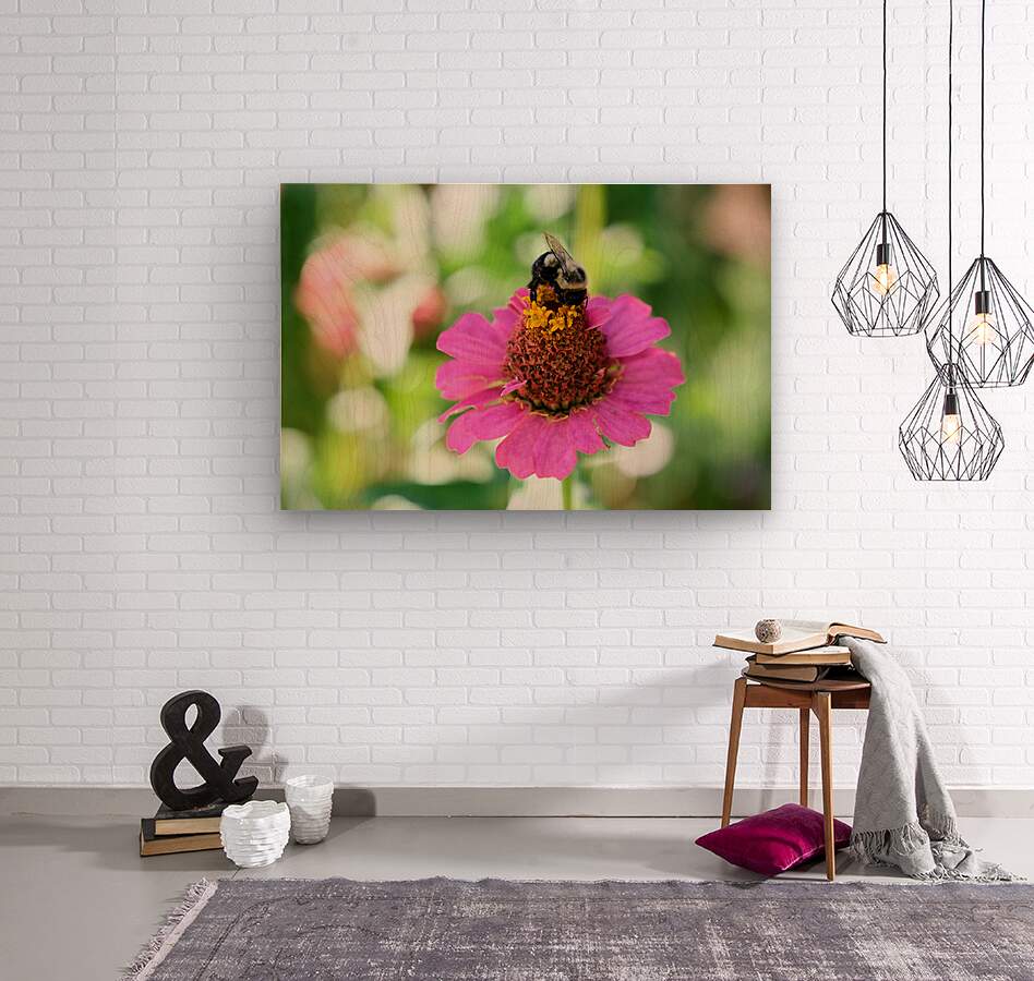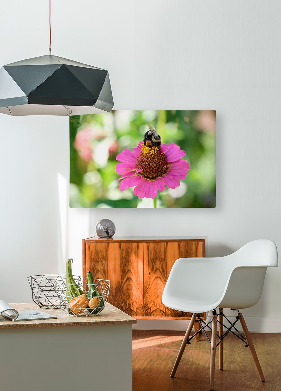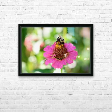 The Bee Collection.In this vivid close-up, a bee finds sanctuary in the bloom of a zinnia, its fuzzy body nestled in the richness of nature's offering. This image is both a celebration of ecology and a tribute to the elegance of hard work without applause. This image embodies the spirit of dedication and the unnoticed rhythms that sustain the world. Perfect for workspaces, meditation rooms, or eco-conscious homes, it serves as a reminder of the value of consistency and unseen impact.