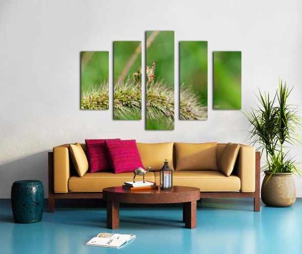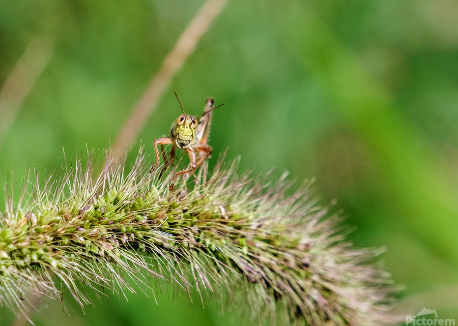 A grasshopper perches delicately on the feathery spine of a wild grass, like a whispered thought lingering on a breeze. The foreground bristles glow with life, while the background dissolves into a wash of green serenity. The harmony of natural form and fine detail reveals a moment between movement and memory. A contemplative piece for bedrooms, libraries, or reflective spaces. It speaks of fragility and fortitude, the quiet power of nature’s smallest actors, and the beauty found in soft-spoken resilience. A daily nudge to find grace in stillness.