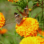 Butterflies Collection.A meeting of wonders: the marigold, with its deeply curled petals, burns like a floral ember beneath a butterfly bearing eyes o...[+]