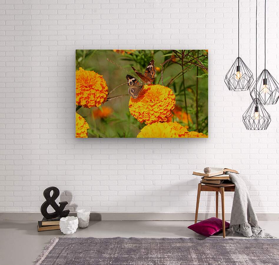 Butterflies Collection.A meeting of wonders: the marigold, with its deeply curled petals, burns like a floral ember beneath a butterfly bearing eyes on its wings. Their juxtaposition the grounded bloom and the air-bound insect feels symbolic. A story told in symmetry, curve, and saturated color. For those who see meaning in nature’s metaphors, this is more than a photo, it’s a dialogue of opposites: earth and air, color and calm, movement and pause. Hang it in places of inspiration a writing desk, a classroom, or a quiet café.