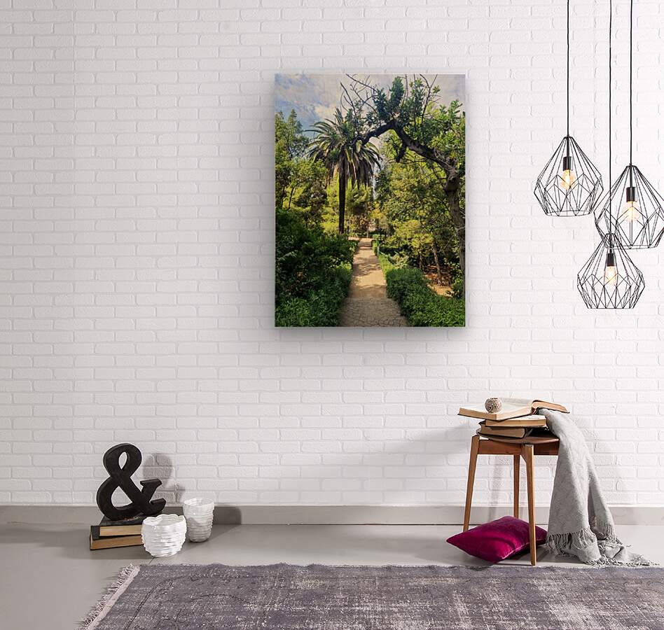 This image is a love letter to hidden paradises. It guides the eye (and the spirit) down a sun-dappled trail where towering palms stand like silent guardians of peace. Surrounded by vibrant greens and framed by an unexpected arc of nature, it draws the viewer forward, invoking a yearning for simplicity, retreat, and a return to wonder. As a wall piece, it's perfect for a meditation room, office, or reading nook—a daily window into a more grounded, beautiful world.