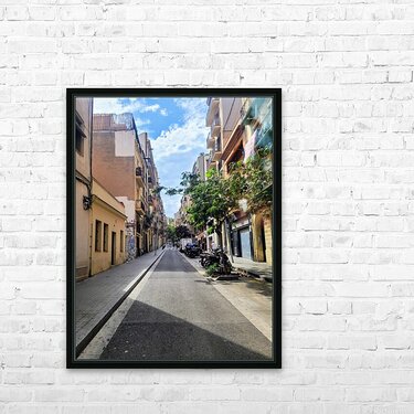 Walking Barcelona Collection. Tells the tale of a neighborhood built on sun-warmed walls, sleepy trees, and the invisible poetry of passing air. Each balcony, slightly imperfect, leans into the street as though reaching for the day. There's movement in stillness — a sense that something just happened, or is about to. This image is ideal for walls that crave subtle emotion, visual storytelling, and the elegant imperfection of old cities. Hang it in spaces where the breeze — real or remembered — matters.