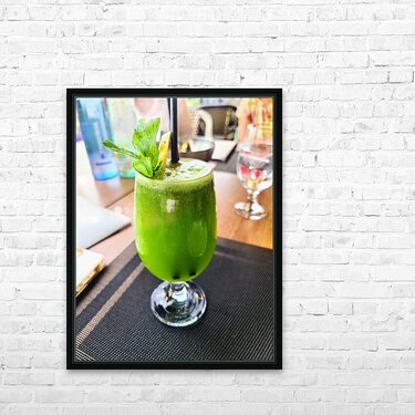 An explosion of nature’s flavor and color captured in a single moment. The lush green drink bursts with garden-grown energy — fresh mint, citrus brightness, and herbal complexity. This photo embodies the essence of botanical living, where every ingredient tells a story and every sip is an act of self-care. This piece transforms kitchens, cafés, or health-focused interiors into vibrant sanctuaries. It energizes the viewer with a feeling of movement and growth, making it ideal for spaces rooted in nourishment, creativity, and nature-inspired design. “Botanic Burst” is not just décor — it's an homage to the flavors of life.