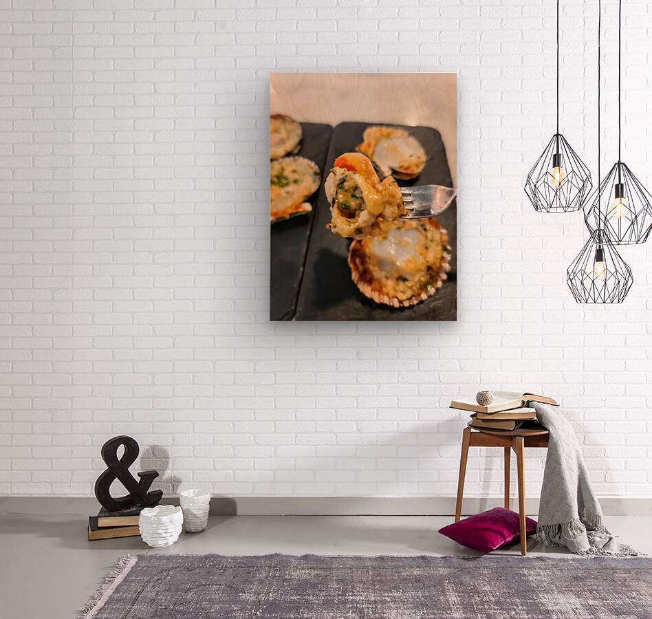 The act of dining becomes a lyrical performance. A succulent scallop, gleaming under a melty cheese layer and finely chopped herbs, is lifted like a crescendo off its scallop shell. This piece speaks to the harmony between sea and plate, between human touch and natural beauty. As wall art, it lends a poetic spirit to the kitchen or dining space—elegant, refined, and deeply evocative of the sea’s quieter moments. Ideal for those who cherish subtlety, beauty, and the unspoken music in a well-composed dish.