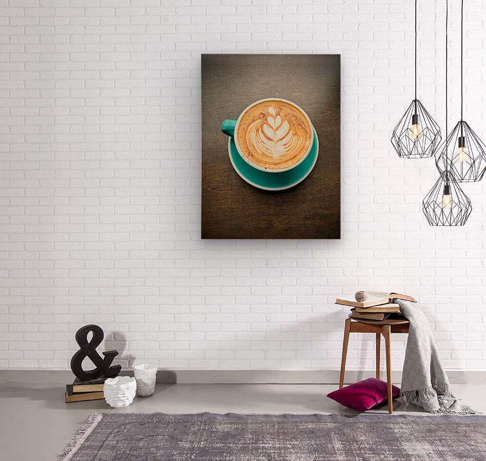 A minimalist photograph showcasing intricate latte art in a bold teal cup. Ideal for anyone who loves coffee and calm, this piece adds a comforting vi...[+]