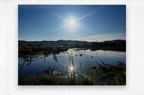 Morning sunrise during a jog in La Crosse. Wisconsin Collection-A captivating capture of the sun beaming over a peaceful wetland landscape, casting a golden glow across the sky and its reflection on the still water below.