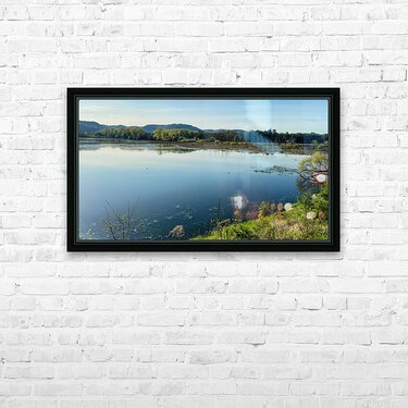 Tranquil and serene, this peaceful landscape captures the stillness of a reflective lake bordered by lush greenery and distant forested hills. The gentle ripples on the water and the soft blue sky add a sense of calm and natural beauty, making this an ideal image for wall art, nature-themed decor, or digital backgrounds. The composition evokes a deep connection to the outdoors and the quiet charm of untouched nature.
