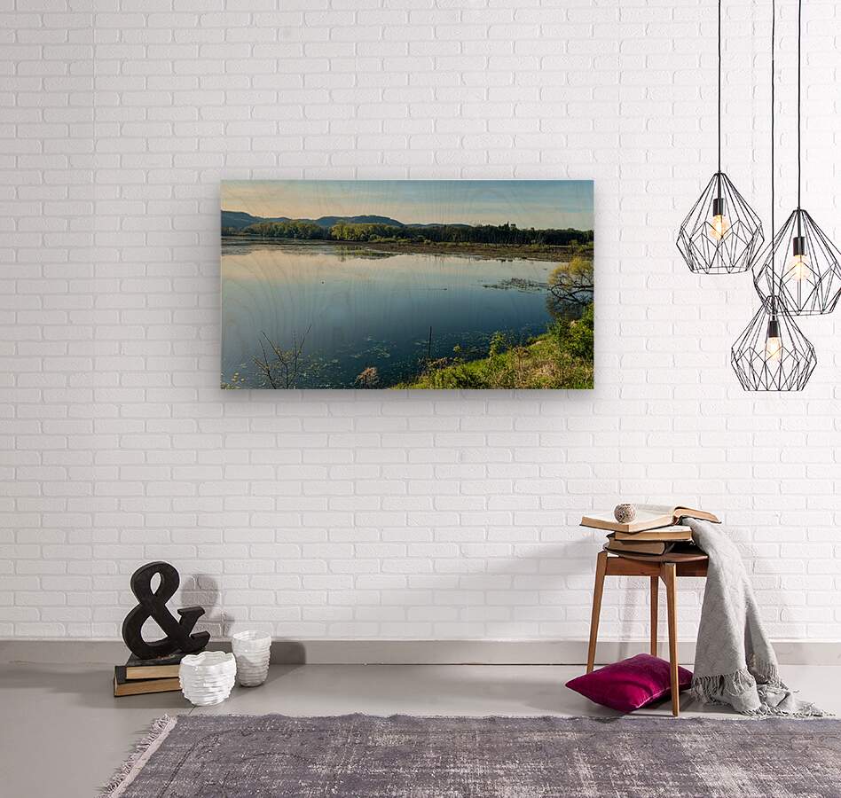 Serene Lakeside View with Forest and Hills Wood print