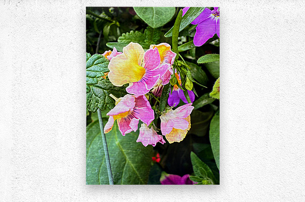 A vibrant close-up of a colorful flower arrangement in full bloom. This lively composition features a mix of bright pink, purple, and yellow blossoms surrounded by lush green foliage. The detailed textures and vivid hues capture the essence of spring and summer, making it perfect for nature lovers, garden enthusiasts, or floral-themed wall art.