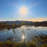 SUNRISE OVER TRANQUIL WETLANDS WITH SUNBEAM REFLECTION
