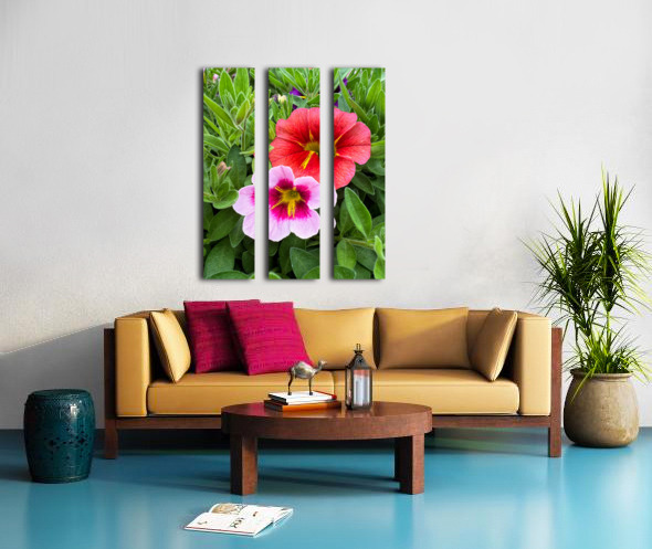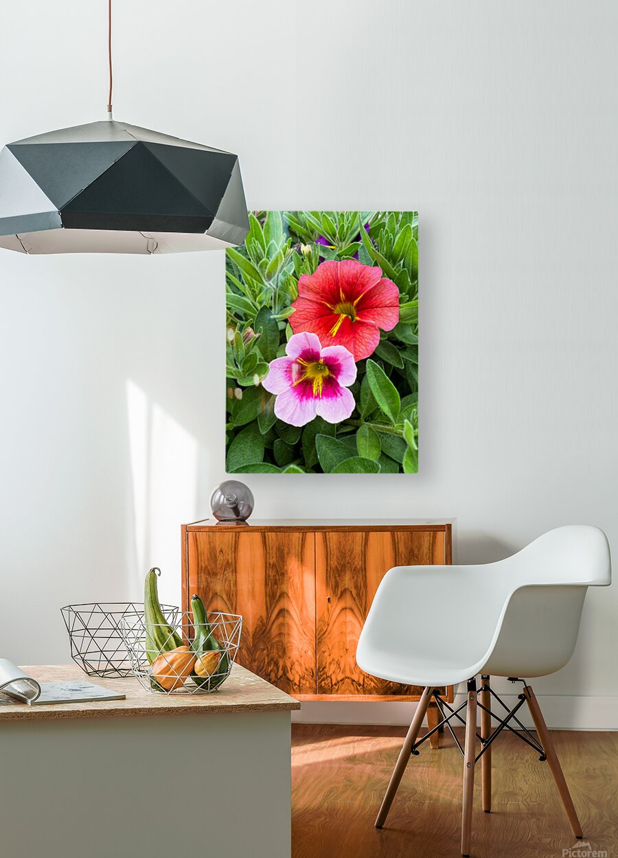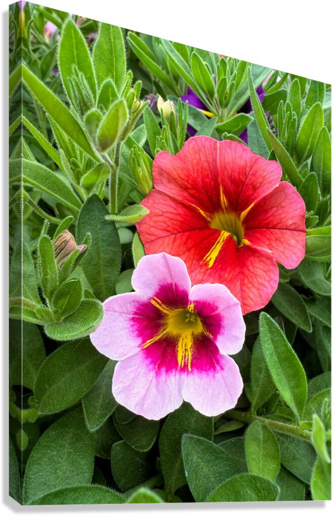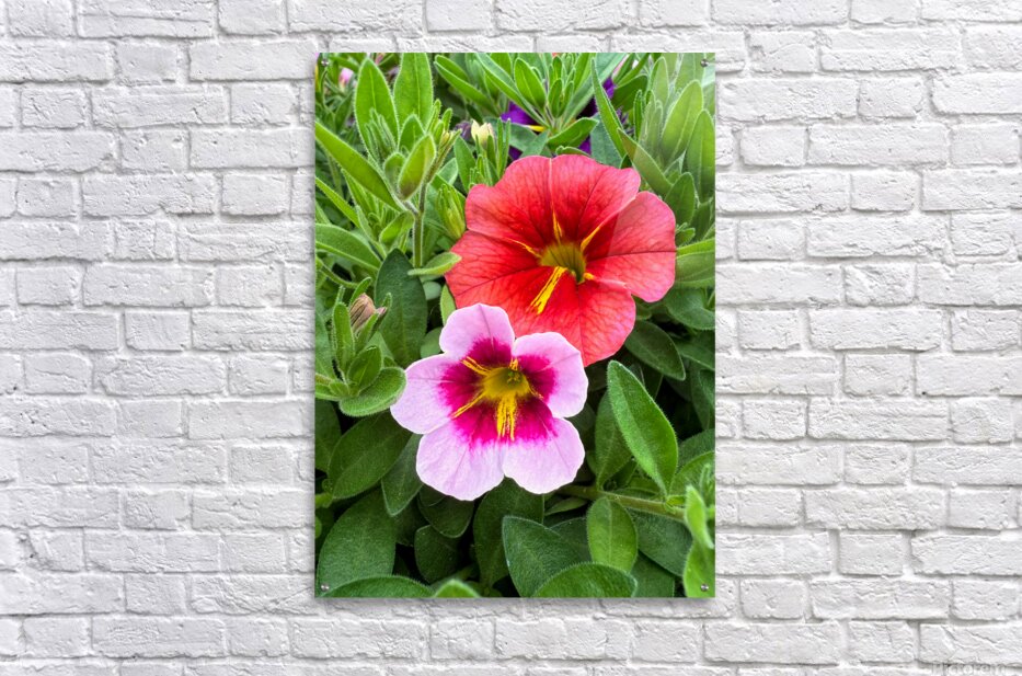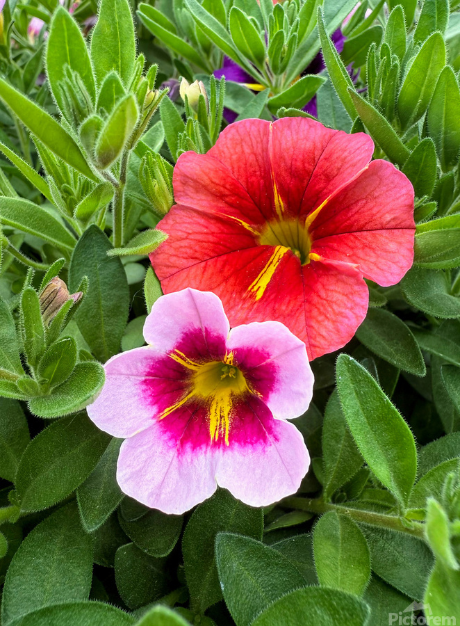 A celebration of nature's expressive voice—two vibrant petunias, performing in visual harmony. Like vocalists in a duet, one sings in bold crimson, the other in delicate pink, yet together they create a radiant, balanced melody. Surrounded by vivid greenery, their contrast amplifies their unity, making this image feel both spontaneous and composed. This piece infuses spaces with energy and creativity. Ideal for eclectic rooms, studios, or bright hallways, it delivers both aesthetic delight and emotional resonance. Let this floral duet bring music to your walls.