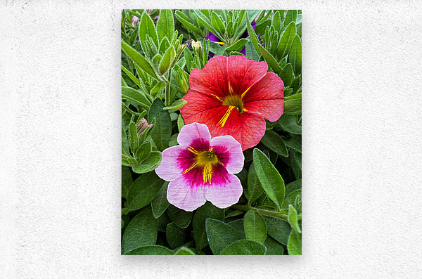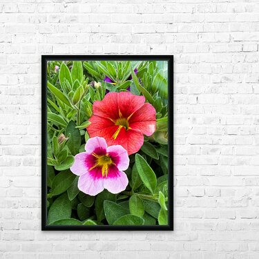 A celebration of nature's expressive voice—two vibrant petunias, performing in visual harmony. Like vocalists in a duet, one sings in bold crimson, the other in delicate pink, yet together they create a radiant, balanced melody. Surrounded by vivid greenery, their contrast amplifies their unity, making this image feel both spontaneous and composed. This piece infuses spaces with energy and creativity. Ideal for eclectic rooms, studios, or bright hallways, it delivers both aesthetic delight and emotional resonance. Let this floral duet bring music to your walls.