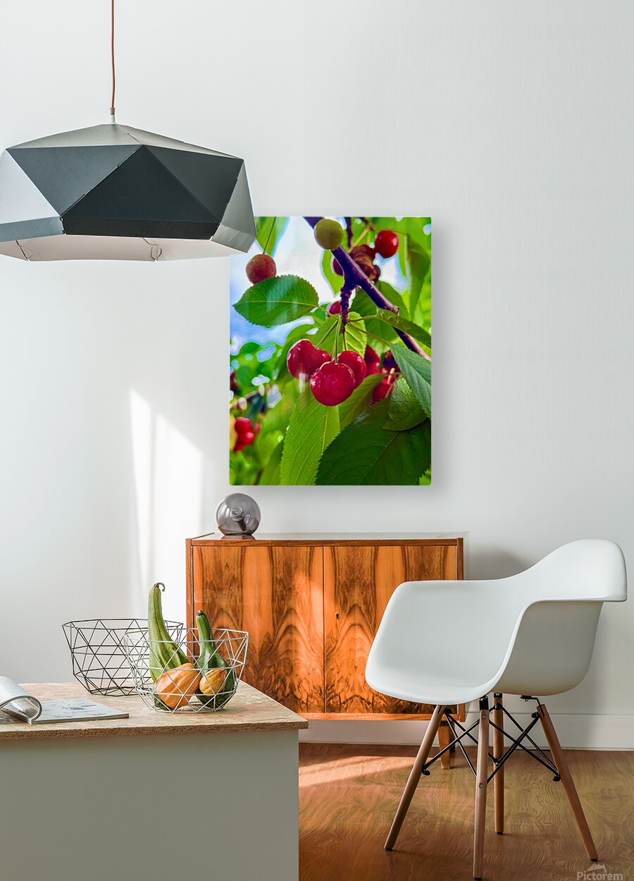 Beneath a soft summer sky, nature reveals her quiet rhythm. This close-up shot captures cherries in various stages of ripeness, glowing with dew-kissed vibrance among sunlit green foliage. From the muted green of new fruit to the rich crimson of maturity, this image embodies time, growth, and seasonal magic a visual poem written by sunlight and soil. On your wall, this piece becomes a heartbeat of summer’s quiet beauty. It speaks to transitions of time, of self, of nature’s cycles—and brings a refreshing, organic warmth to your space. Perfect for kitchens, garden rooms, or calm nooks that celebrate the joy of growth and ripening potential.