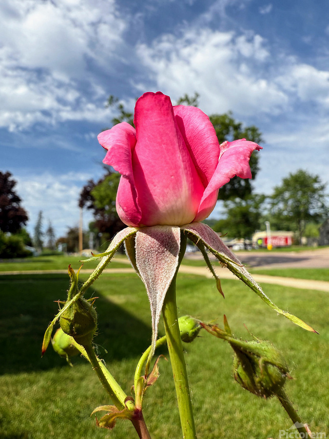 A fiery pink rosebud stands illuminated, like an ember glowing within the green quiet of the garden. It is a symbol of restrained passion, a visual wh...[+]