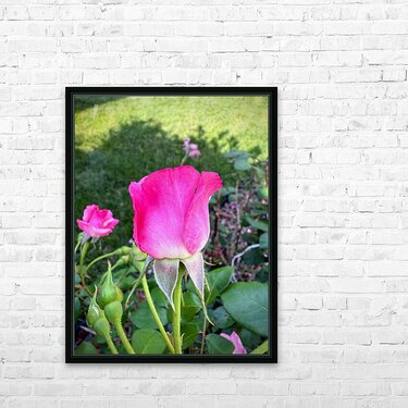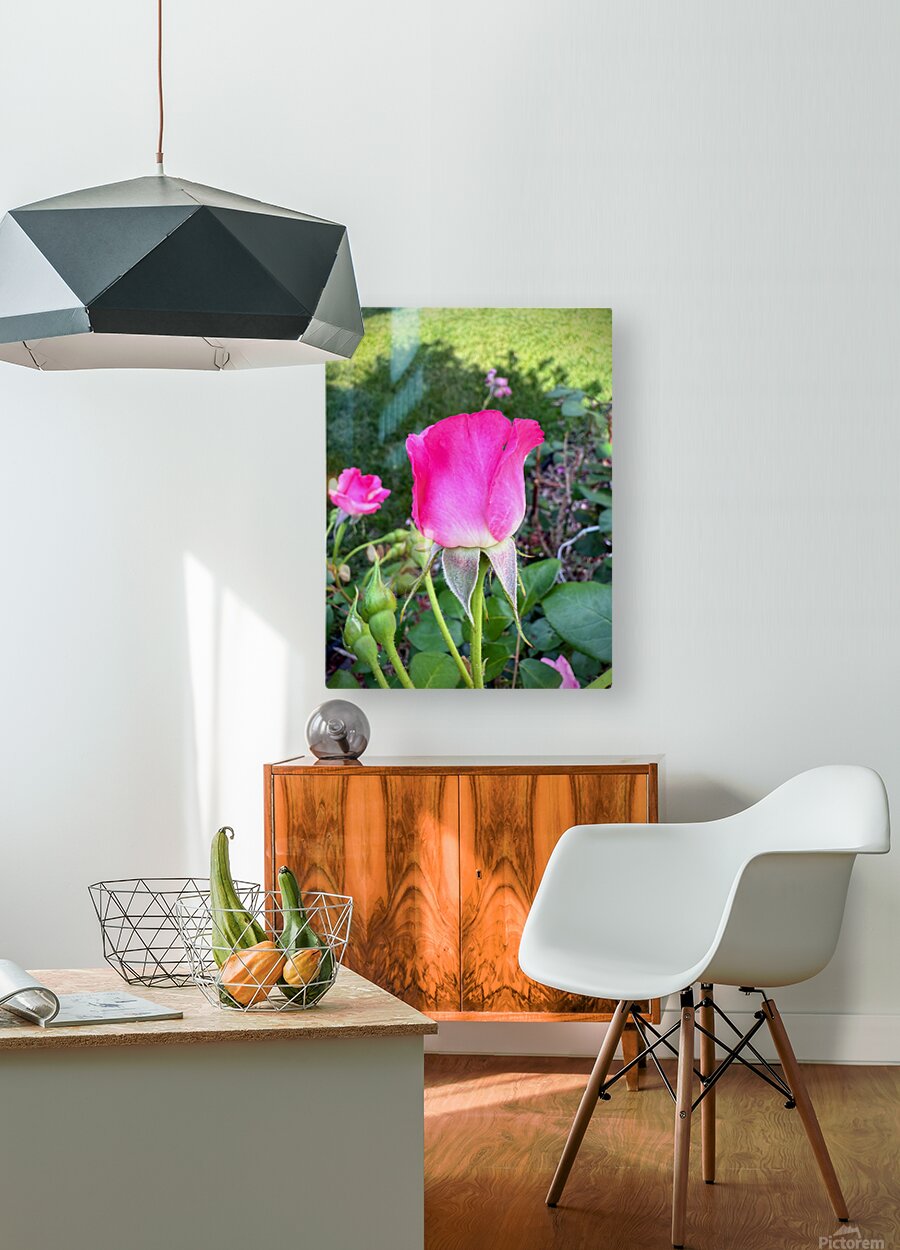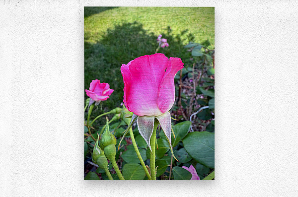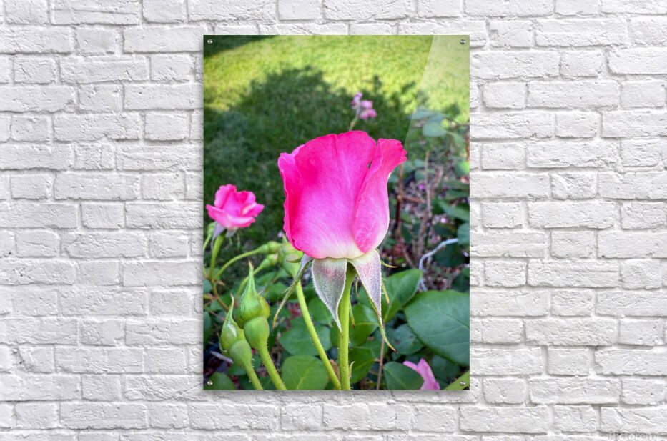 Like a guardian of nature’s secrets, this rosebud cloaked in velvet-pink petals emerges among leafy companions, backlit by the soft play of sunlight and shadow. Each tiny hair on the stem and sepals reveals a microcosm of quiet intensity. On your wall, it evokes strength within softness—a balance of fierce guardianship and delicate allure. It's a powerful metaphor for grace under pressure and a tribute to protective beauty.