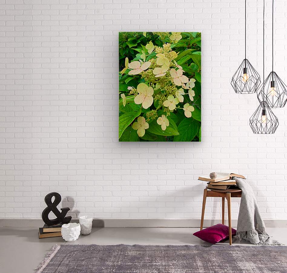 This delicate hydrangea cluster glows in soft tones of cream and blush, set against vivid green leaves. The photograph’s gentle hues and fine textures evoke calm and introspection, perfect for spaces that need a breath of serenity and quiet elegance.