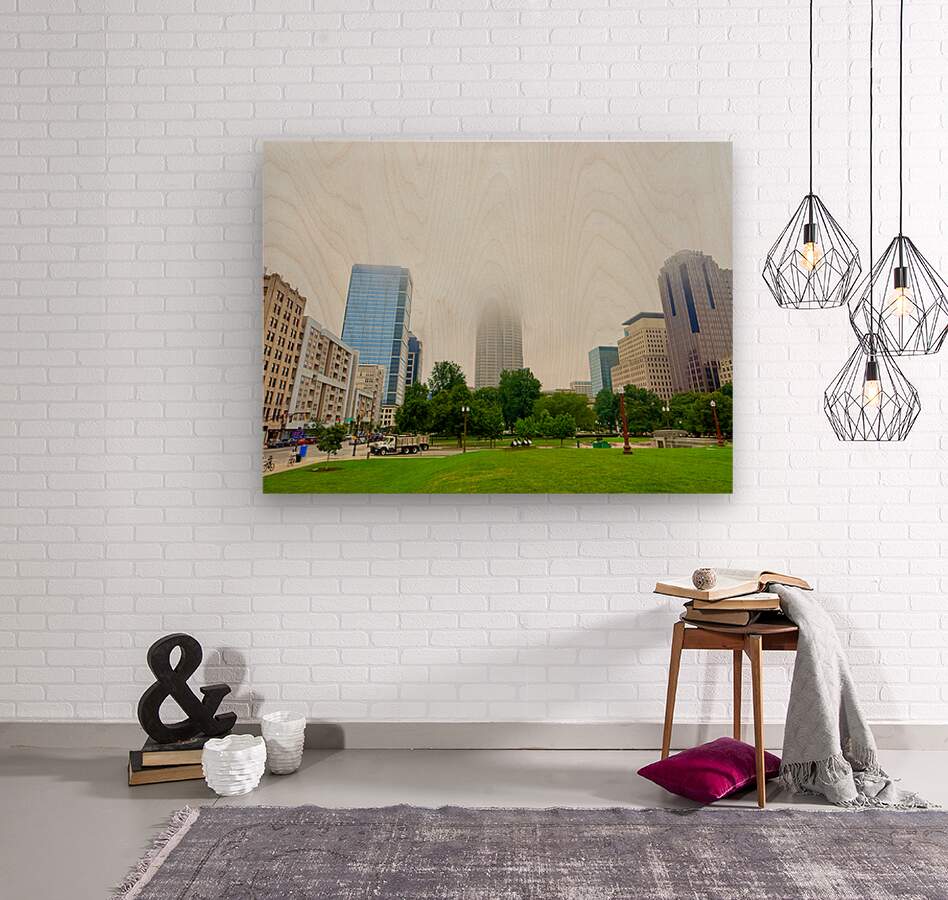 captures the subtle intersection of natural beauty and metropolitan might. The fog gently veils the city’s tallest structure, giving it a dreamy, drifting appearance above the bright green lawn. This piece brings balance to any wall, merging open space with urban elegance, making it ideal for reception areas, creative studios, or living rooms looking to convey grounded ambition.