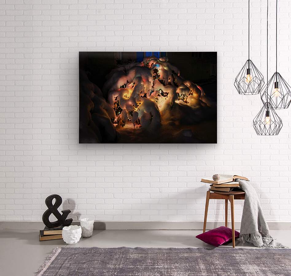 Winter Wonderland Collection. Despite the cold, winter can bring beautiful scenic views with glistening snowfall in nature. This underneath the heavy later of snow is a bush decorated with Christmas lights.