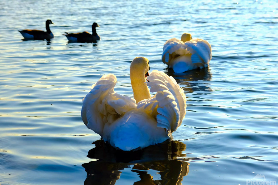 Swan Collection. Captures a serene moment on a sunlit lake as graceful swans glide across shimmering water. The subtle curve of the wings forms a heart-like silhouette, evoking feelings of tenderness, unity, and devotion. This photograph is a gentle reminder of the quiet beauty that exists in nature and relationships, perfect for adding warmth and emotional depth to living rooms, bedrooms, or workspaces. As wall art, it serves as a meaningful piece for anyone who cherishes nature’s elegance and the symbolism of loyalty and harmony