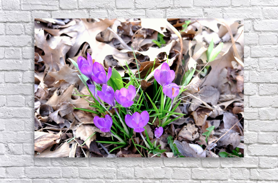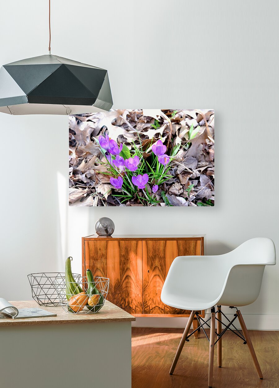 Blooms of Joy Collection. This piece perfectly encapsulates the scene of purple crocuses emerging through winter’s fallen leaves. Crocuses are among the first flowers to bloom and are widely associated with happiness, the arrival of spring, and new beginnings. Their appearance after a long winter represents the triumph of life over darkness and the renewal of nature. Purple crocus blooms also carry connotations of dignity and spirituality. As wall art, it invites viewers to reflect on resilience and renewal, bringing a hopeful and optimistic tone to any space.