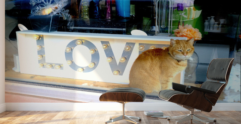 A ginger cat rests beside a glowing "LOVE" sign, nestled in a shop window, quietly surveying the outside world. This image captures the juxtaposition ...[+]