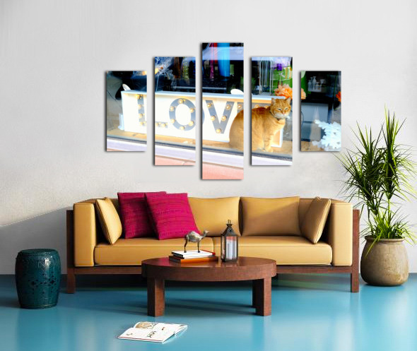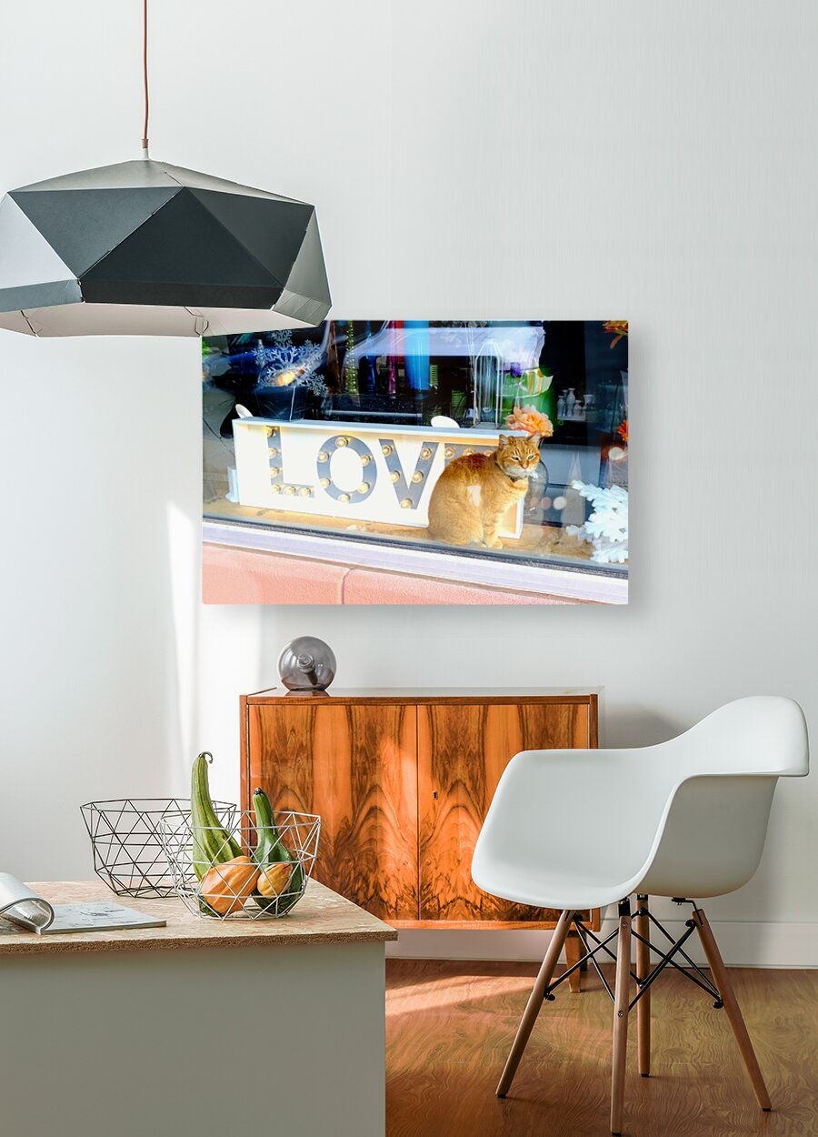 A ginger cat rests beside a glowing "LOVE" sign, nestled in a shop window, quietly surveying the outside world. This image captures the juxtaposition of warmth and curiosity man's indoor sanctuary against the vibrant street life beyond. Perfect for living spaces or reading nooks, it speaks to the contentment found in stillness and the quiet joy of observation. A lovely homage to everyday beauty and unexpected companionship.