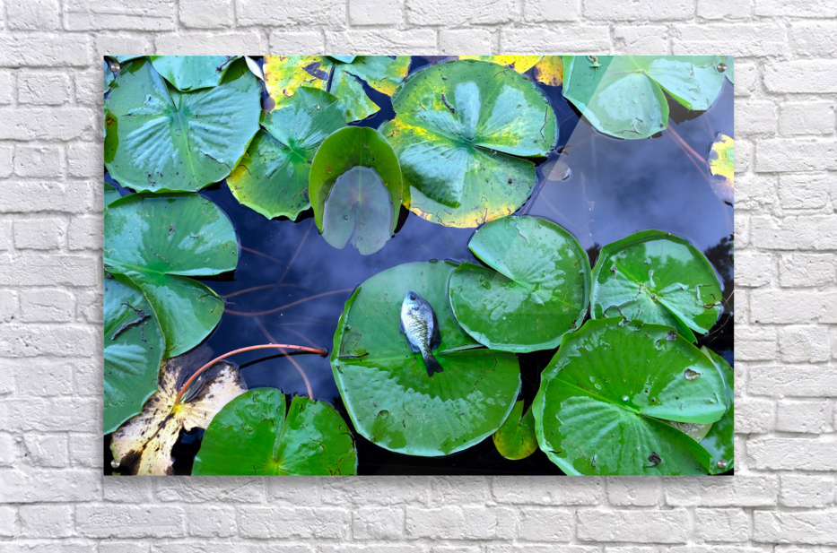 This little sunfish jumped out of the water and laid on top of the water lily on a very hot summer day. A bold and unexpected composition, this image shows a sunfish atop a wet, vibrant lily pad, as if caught in an eternal pause. The glistening greens contrast with deep blue reflections of the sky, while the yellowing leaves hint at seasonal change. The subject invites reflection: Is it peace or departure? Stillness or surrender? As fine art, this piece is a visual conversation starter, suited for modern interiors where emotion, abstraction, and nature converge.