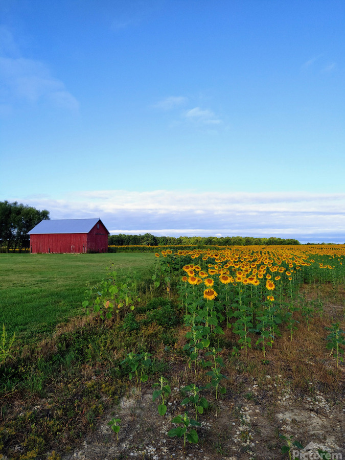 Sunflower Collection. Came across the sunflower farm on a road trip in 2023 in Indiana. The field of sunflowers was like a carpet of sunshine! In this image the loudest voice belongs to the land. This minimalist landscape invites the viewer into a moment of absolute calm a horizon bathed in sunlight, filled with rows of sunflowers, all beneath an endless blue sky. The barn, while bold in color, does not dominate but rather complements the field’s rhythm. It is a visual poem to quietude and mindfulness. As wall décor, it suits minimalist, modern, or nature-inspired interiors where space and mood matter more than detail. A meditative piece perfect for bedrooms, yoga studios, or anywhere peace is prized.