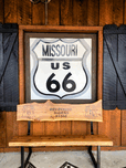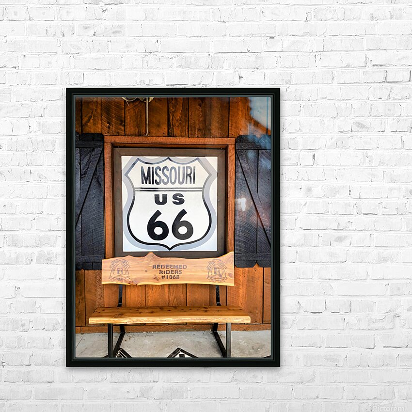 Driving to Dallas from the Midwest and came across this stop at a restaurant called Missouri Hick BBQ. This sign was at the entrance and captures the spirit of road trips. Route 66 Collection. This image showcases a framed Missouri US 66 highway sign with a handcrafted bench beneath, a scene that embodies the warmth of American heritage. The textures of wood and signage, together with subtle religious hints from the “Redeemed Riders,” make this a meaningful addition to both modern and traditional decor styles.
