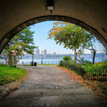 Riverside Park View of Twin Towers in New Jersey. Riverside Park Collection. Soft autumn hues and sharp lines create a harmonious contrast as the tunnel opens into nature’s calm. The photograph celebrates the quiet in-between moments, the pause before entering a new view. A thoughtful and aesthetic addition to any home or office art wall.