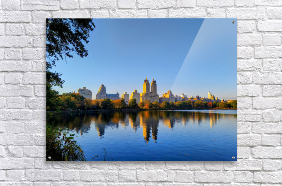 Central Park Reservoir Panoramic Skyline Northview. Central Park Collection. Blending still water with striking architecture, this piece portrays Central Park as a sanctuary nestled within one of the world’s busiest cities. The reflections enhance its soothing quality, making it a perfect print to inspire reflection and calm in any urban or professional setting.