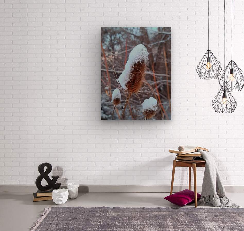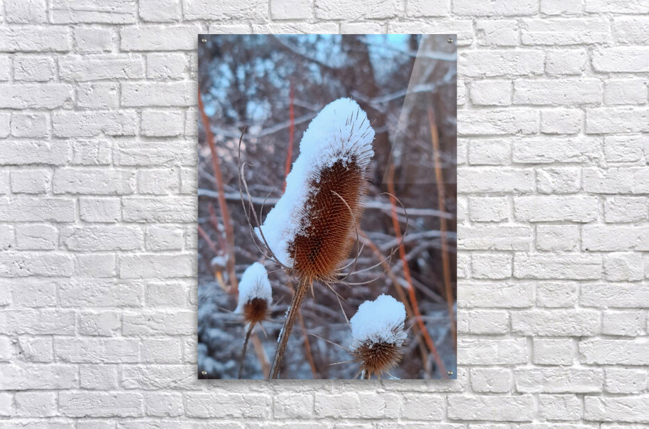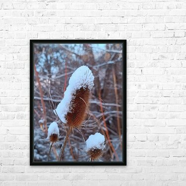 A dried thistle is gracefully capped with snow, standing resilient in a frozen landscape. The sharp textures contrast with the softness of the snow, capturing nature's delicate balance between fragility and strength. As wall art, it offers a moment of stillness and quiet strength, perfect for evoking calm in a study, hallway, or meditation space.