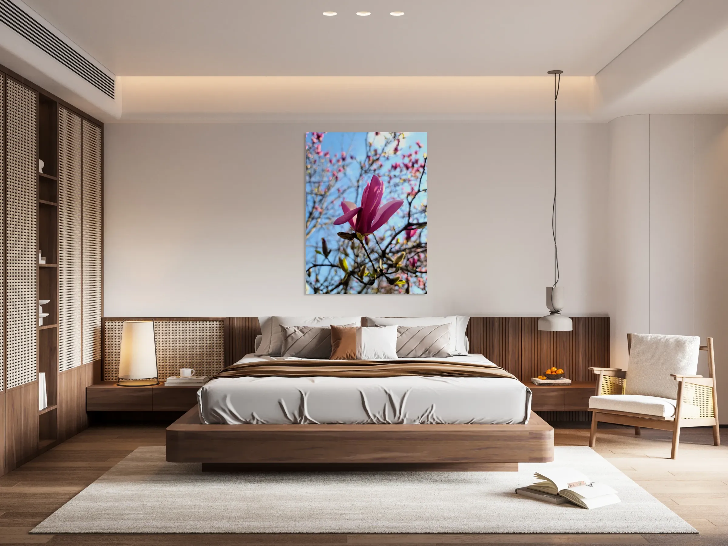 Magnolia Collection. This vivid composition captures a magnolia blossom stretching open under a bright sky, its magenta petals tenderly unfolding as sunlight filters through delicate branches.This floral portrait celebrates the transient yet powerful moments when life reaches for the light. As wall art, this piece is an invitation to pause and connect with the quiet resilience of nature. It brings a feeling of calm energy to any space a gentle reminder that growth happens not with noise, but with grace. Ideal for spaces where introspection, clarity, or peaceful energy is desired, such as meditation rooms, reading nooks, or modern living spaces.
