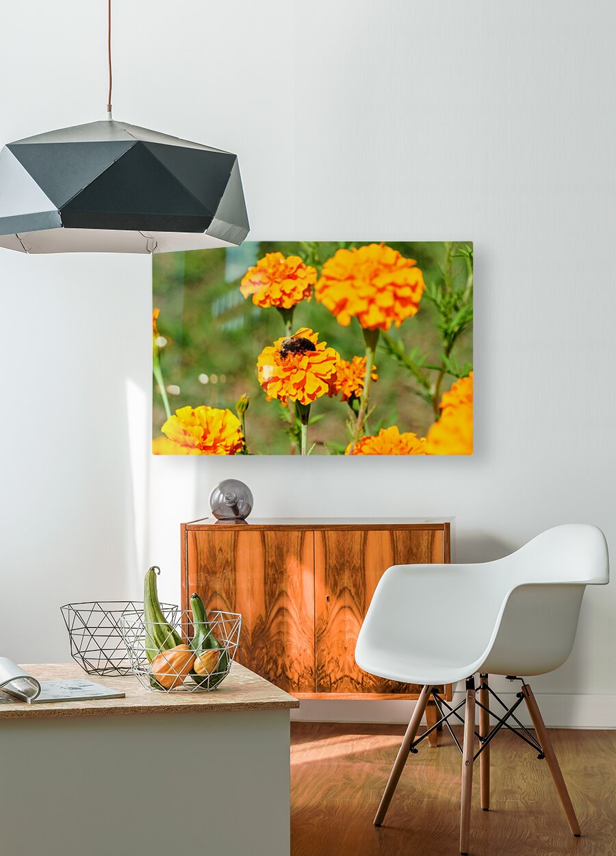 Bee Collection. Underneath a riot of flame-touched petals, a tiny worker fulfills its ancient task. Bright Labors honors the resilience and purpose found in the smallest of actions. Sunlight sets the blooms ablaze in golds and oranges, while the bee becomes both the observer and the life-bringer. Ideal for workspaces or home offices, this image embodies perseverance, contribution, and energy. It's a visual tribute to the quiet strength of nature and of those who dedicate themselves to meaningful effort, no matter the size of their role.