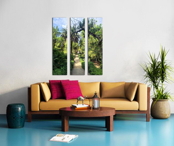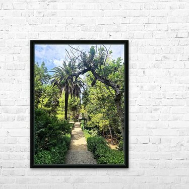 This image is a love letter to hidden paradises. It guides the eye (and the spirit) down a sun-dappled trail where towering palms stand like silent guardians of peace. Surrounded by vibrant greens and framed by an unexpected arc of nature, it draws the viewer forward, invoking a yearning for simplicity, retreat, and a return to wonder. As a wall piece, it's perfect for a meditation room, office, or reading nook—a daily window into a more grounded, beautiful world.
