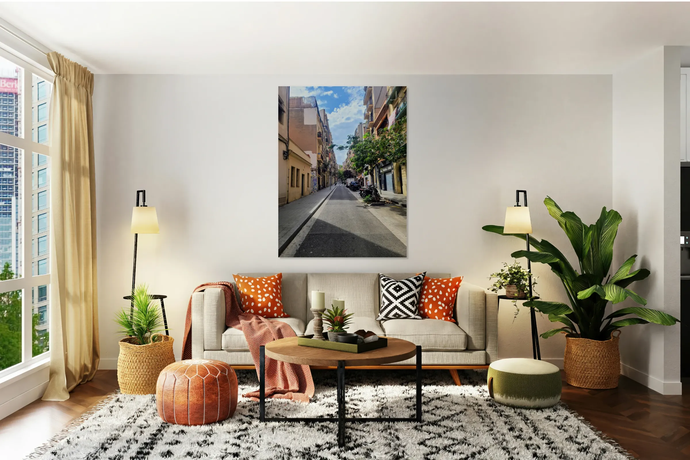 Walking Barcelona Collection. Tells the tale of a neighborhood built on sun-warmed walls, sleepy trees, and the invisible poetry of passing air. Each balcony, slightly imperfect, leans into the street as though reaching for the day. There's movement in stillness — a sense that something just happened, or is about to. This image is ideal for walls that crave subtle emotion, visual storytelling, and the elegant imperfection of old cities. Hang it in spaces where the breeze — real or remembered — matters.