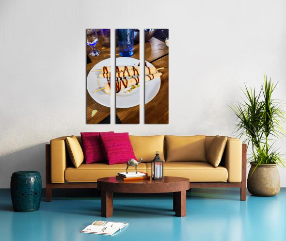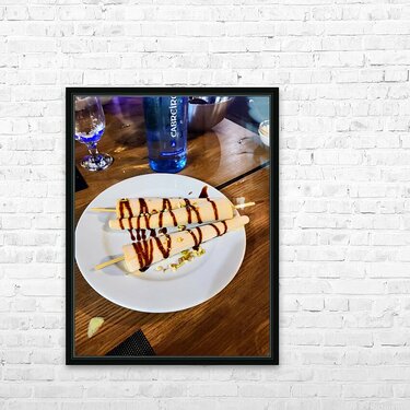 Transforms the concept of dessert into a minimalist symphony of form and flavor. The parallel kulfi sticks become instruments in a sweet concerto, where the flowing caramel becomes musical notation—fluid, expressive, and rich. There’s a graphic rhythm in the lines, a balance in the plating, and a story told in texture and tone. This artwork is ideal for contemporary dining spaces, creative studios, or restaurants where design meets deliciousness. It’s food photography with a bold sense of structure and soul.