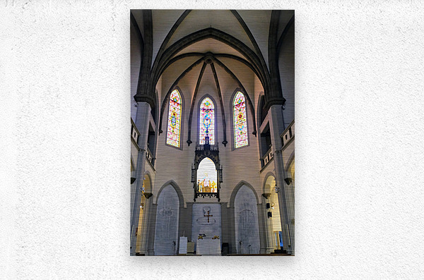 Invites you to gaze upward, as if the sky itself were painted in color and held in glass. Captured inside a cathedral rich with gothic detail, this piece centers on three luminous stained-glass windows rising like gateways to the divine. Beneath them, a softly lit altar glows in humble reverence. As wall art, this photograph speaks to the soul's quiet yearning for connection—between earth and heaven, matter and spirit. Perfect for sacred spaces, tranquil homes, or anyone who finds beauty in stillness and light. A timeless image to elevate both wall and mind.