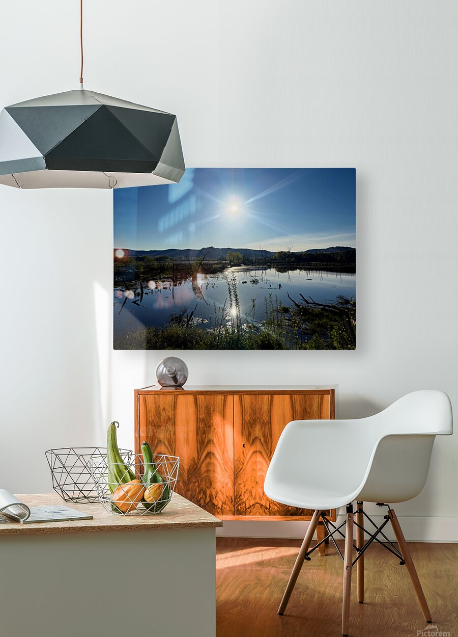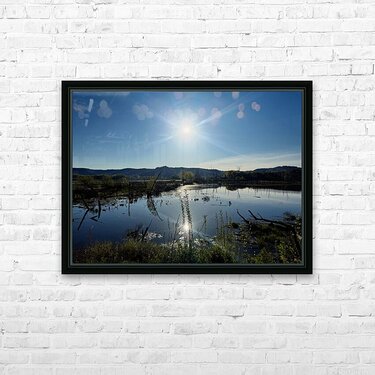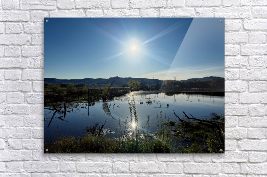 Morning sunrise during a jog in La Crosse. Wisconsin Collection-A captivating capture of the sun beaming over a peaceful wetland landscape, casting a golden glow across the sky and its reflection on the still water below.