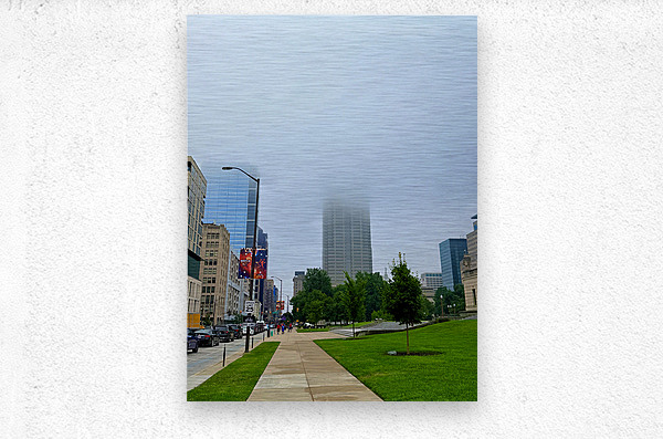 A symmetrical composition highlighting the harmony between nature and structure. The flowerbeds below ground the image in vibrancy, while the fog above softens the corporate skyline. Ideal as wall art for spaces that value balance, grace, and the blend of beauty in opposites.