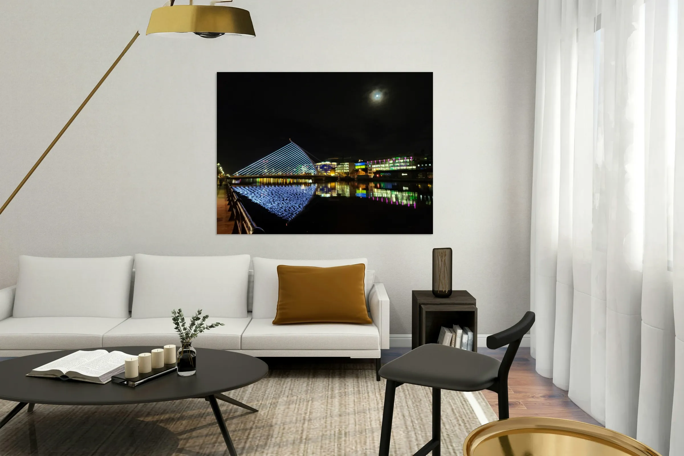 Dreams of Dublin Series. The hustle and bustle of Ireland's business center along River Liffey glimmers peacefully at night. This architecturally unique modern bridge is as beautiful at night as it is during the day time.