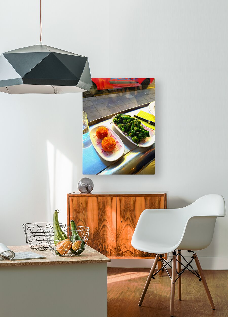 London Collection Feb. 2023. This was taken at a business lunch at a Spanish restaurant called Barrafina. A vibrant, sun-kissed food scene captured through a restaurant window. Bunuelas de Bacalao and Pimientos de Padron glow in warm natural light as a red street vehicle glides past outside. Perfect for kitchens, dining rooms, cafés, and modern culinary spaces.