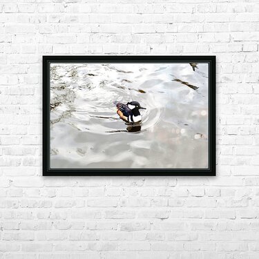 This captivating wildlife photograph features a solitary Hooded Merganser gliding peacefully across shimmering, silver-toned water. As wall decor, it...[+]