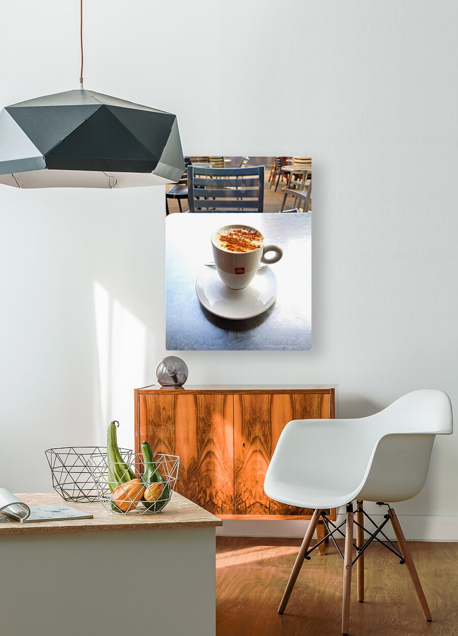 This inviting artwork captures a beautifully frothed chai latte dusted with cinnamon, set on a reflective metal table with soft natural light pouring across the scene. This piece evokes the peaceful ritual of that first warm sip of the day, making it an ideal choice for anyone who loves coffeehouse culture, minimalist still-life art, or cozy, atmospheric décor. Printed as wall art, it adds both warmth and elegance, transforming your space into a serene moment of everyday beauty.