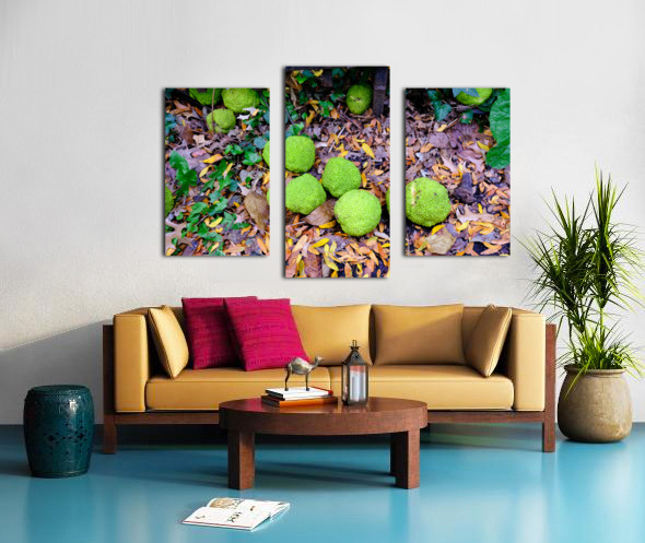 Riverside Park Collection. A cluster of Osage oranges rests among crisp, fallen leaves, creating a serene and slightly whimsical autumn composition. The image draws attention to nature’s overlooked details. As wall décor, it offers a grounded, meditative vibe, ideal for adding texture and seasonal character to your home or office.