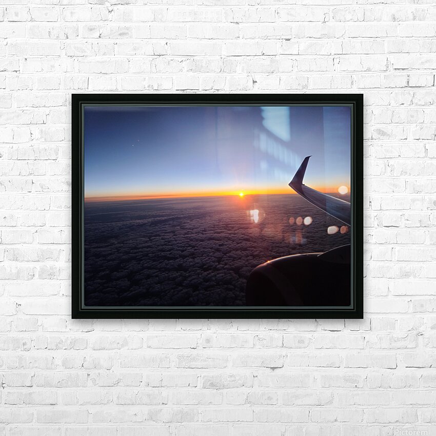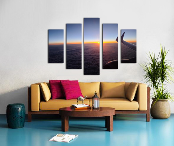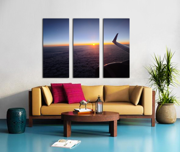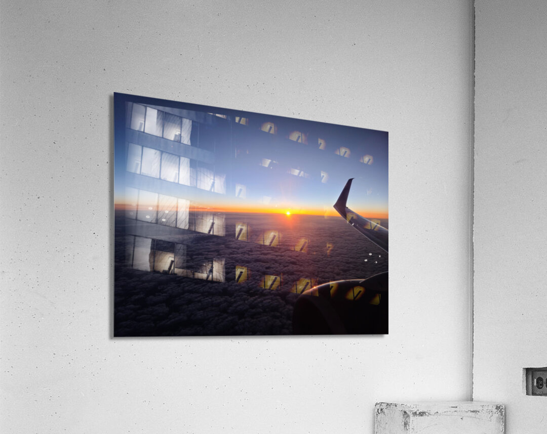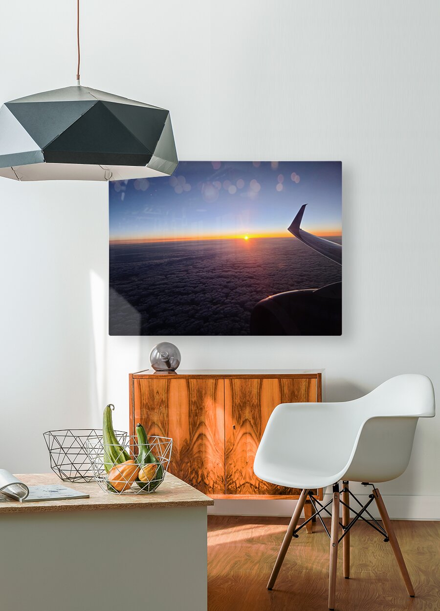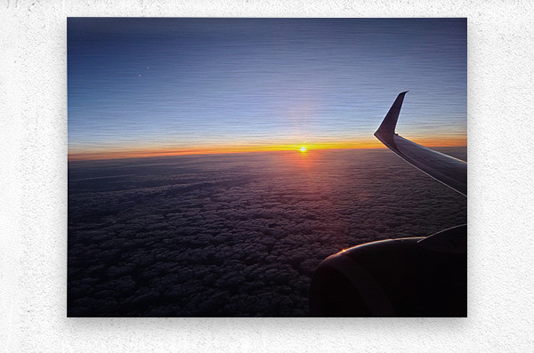 This photograph captures the sublime moment when day meets night above the clouds. The setting sun radiates gold and amber hues across a soft, cotton-like cloud layer, viewed from an aircraft window. As wall art, this image evokes tranquility, wonder, and the spirit of exploration, perfect for anyone inspired by travel and the beauty found in high places.