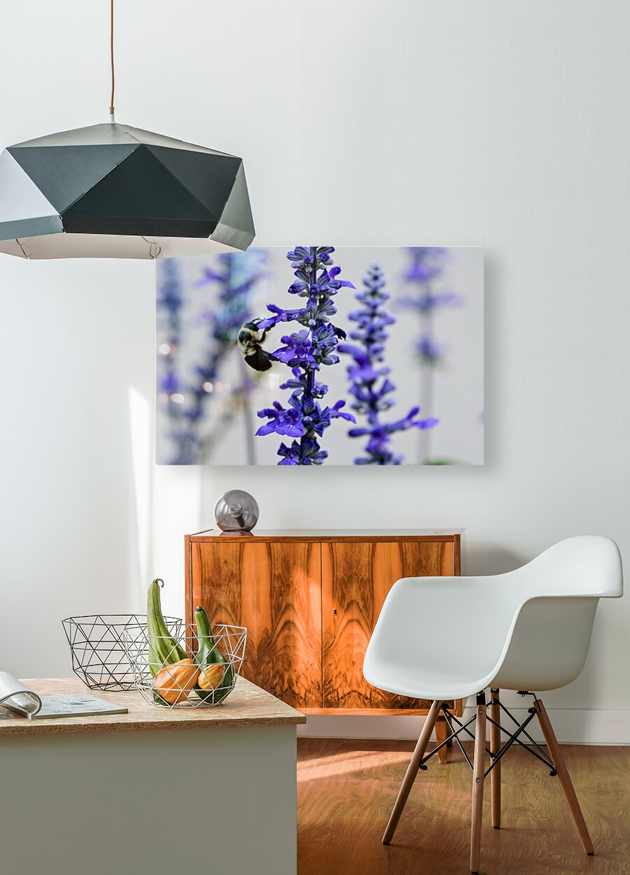 The Bee Collection.A simple and striking photo of a bee visiting tall violet salvia flowers. The contrast of dark and light, stillness and motion, makes this a unique snapshot of everyday wonder. This print invites calm and appreciation for nature’s details. It works well in quiet spaces like reading rooms, bedrooms, or studios, bringing a peaceful energy to the space.