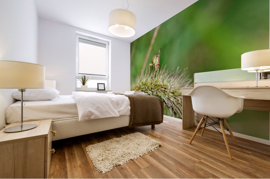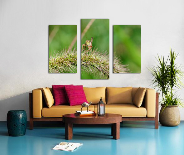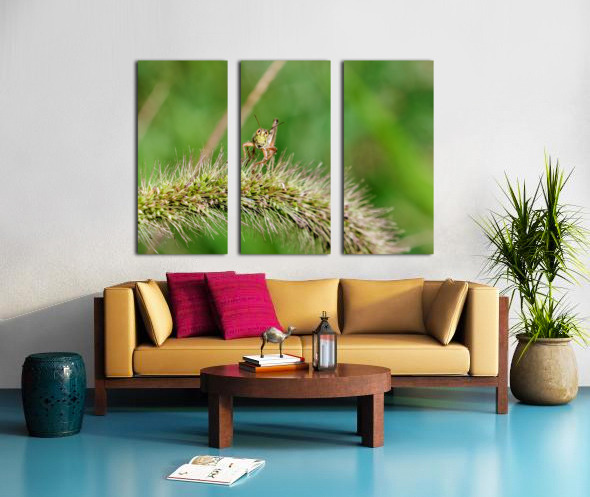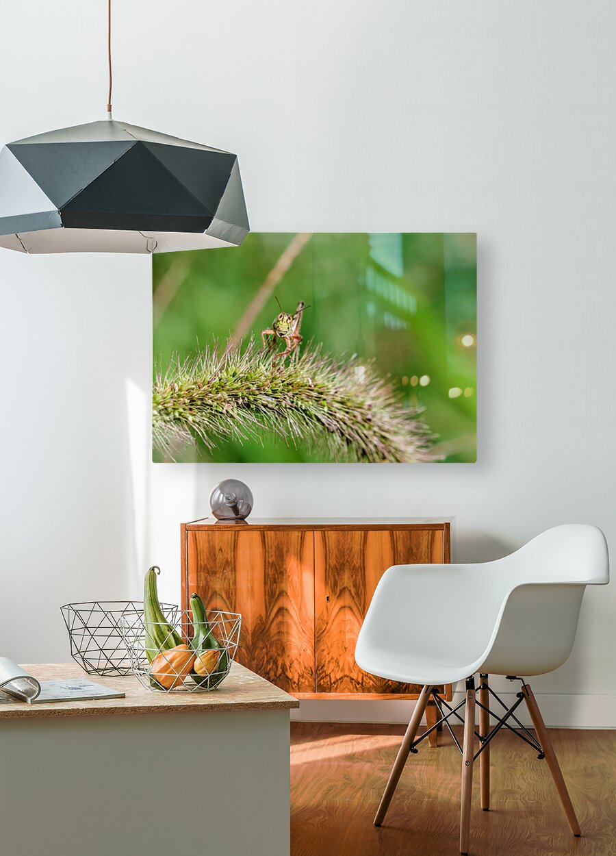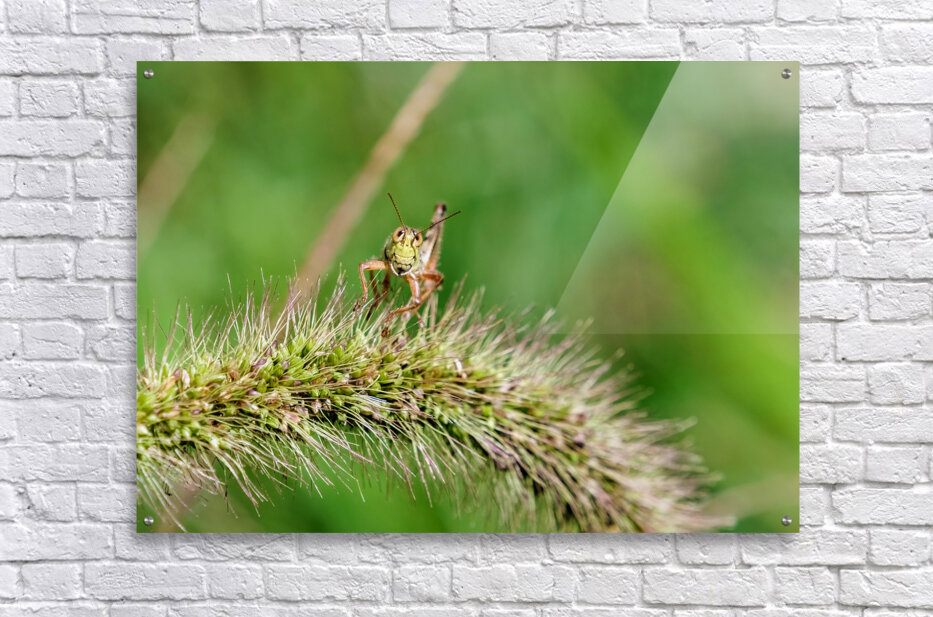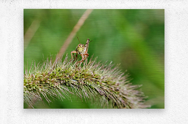 A grasshopper perches delicately on the feathery spine of a wild grass, like a whispered thought lingering on a breeze. The foreground bristles glow with life, while the background dissolves into a wash of green serenity. The harmony of natural form and fine detail reveals a moment between movement and memory. A contemplative piece for bedrooms, libraries, or reflective spaces. It speaks of fragility and fortitude, the quiet power of nature’s smallest actors, and the beauty found in soft-spoken resilience. A daily nudge to find grace in stillness.