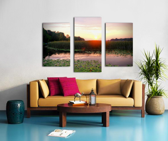 Sunrise Collection. In this breathtaking scene, the day's first light spills over a lily-laced wetland, igniting the sky in soft hues of pink, gold, and lavender. The water mirrors the awakening sky while delicate lily pads float silently, untouched. The reeds stand still like sentinels of peace, listening to the hushed whispers of nature's new beginning. This moment is not just the start of a day, but the unfolding of a story held in stillness and light. As wall art, this piece speaks of reflection, calm rebirth, and the profound beauty found in quiet spaces. It evokes an emotional pause, a daily invitation to begin again with gentleness and purpose. Ideal for spaces meant to center and ground, like meditation rooms, bedrooms, or retreats.